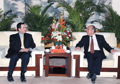 6月8日,美国通用汽车底盘公司亚太采购总监马可·卡普拖等一行来访万向。图为鲁冠球与马可·卡普拖就相关事宜进行交流。