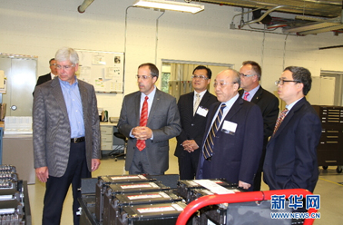 7月21日,美国密歇根州州长里克·斯奈德(左一)、中国驻芝加哥领事馆总领事赵卫平(中)、万向集团董事局主席鲁冠球(右三)在位于美国密歇根州安阿伯市的A123系统公司车间参观工人组装电动汽车电池。 在中国民营企…