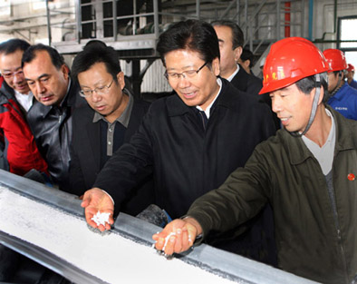 左起:顾峻源、库热西·买合苏提、赵文泉、张春贤、刘利鹏(新疆硝石钾肥公司副总经理)正在生产线上参观视察。 新疆自治区党委书记张春贤在视察硝石钾肥基地时认为万向在新疆的事业很有意义很有前途·万向的成功是不断进行结构调整的结果·万向新疆项目的总…
