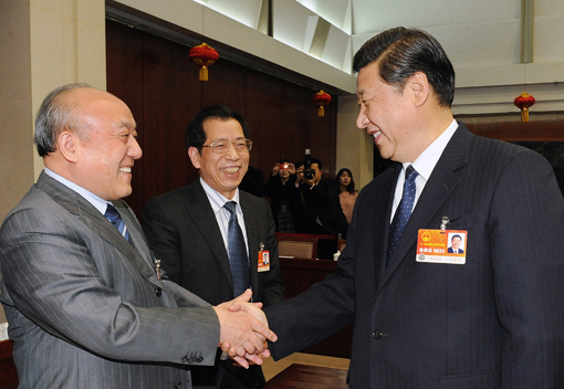 2011年3月8日,国家副主席习近平在看望浙江省全国人大代表时与鲁冠球亲切握手。他鼓励鲁冠球,要抓住机遇,缩小中国制造业与世界先进水平的差距。 黄曙林 摄