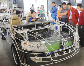 第九届杭州国际汽车展上 10月16日,在第九届中国杭州国际汽车工业展览会上,万向电动汽车展出了新款电动汽车和纯电动电力服务车。万向汽车展台上电动结构展示车吸引了众多参观者,很多人兴致勃勃地坐上去试乘。 此届车展的主题是“休闲·环?!ご葱隆?/p>