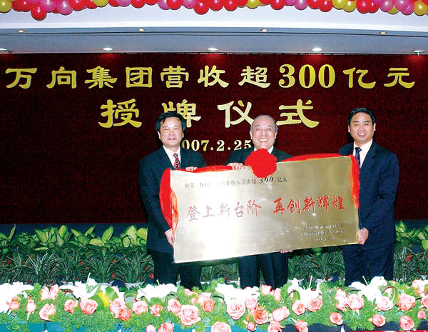 鲁冠球(中)从区长郑荣胜(左)、区委书记洪航勇手中接过贺匾。 新春伊始,万象更新。2月25日,农历正月初八,新年上班第一天,萧山区委、区政府隆重举行为强镇街、强企业上门送匾庆贺活动,热烈祝贺他们在过去一年中所取得的优异成绩。万向以营业收入首…