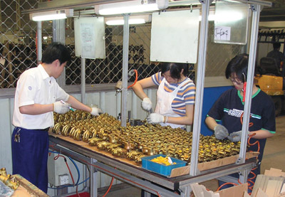 遏制、清洗生产线是系统公司某系列产品出厂前的最后一道工序生产线,主要负责对该产品六个品种外观、镀锌质量、重要尺寸、关键机加工尺寸进行遏制以及除锈、清洗、防锈、包装等工作。 图为员工在操作后支架遏制、清洗生…