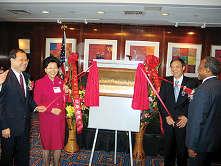 (由左至右):刘碧伟总领事、马秀红副部长、周文重大使、丹尼尔州务卿共同为总商会揭牌。 马秀红副部长与鲁慰芳(左一)、许泽敏合影。 美国中国总商会成立大会在纽约隆重举行胡锦涛主席亲切接见理事会成员并合影留念万向美国公司当选常务理事单位、倪频…